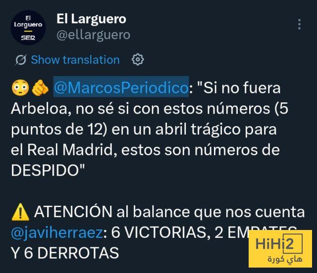 حديث للصحفي لوبيز : ” لو لم يكن أربيلوا ، لا أعرف أن كانت هذه الأرقام 5 نقاط من أصل 12 في شهر أبريل الكارثي لريال مدريد ، فهي أرقام تؤدي إلى الإقالة “