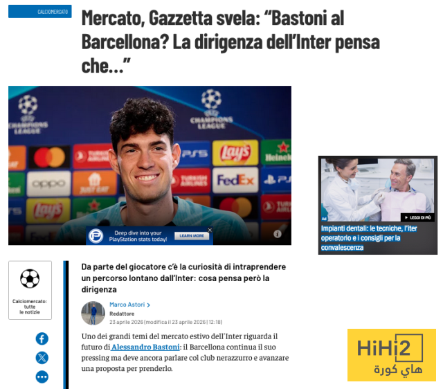تشير تقارير صحفية إيطالية إلى أن مستقبل أليساندرو باستوني داخل إنتر ميلان يظل من الملفات المهمة في سوق الانتقالات الصيفية، مع استمرار اهتمام برشلونة بالتعاقد مع المدافع الإيطالي.