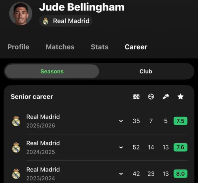 رغم أن البعض المشجعين اعتبروا جود بيلينغهام فاشلًا في الموسم الماضي إلا أنه سجل 27 مساهمة تهديفية بين أهداف وتمريرات حاسمة ، مما يثبت نجاحه سواء تم تقييمه كمهاجم أو كصانع ألعاب .