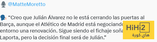 “ أعتقد أن خوليان ألفاريز لا يغلق الباب أمام برشلونة رغم أن أتلتيكو مدريد يجري مفاوضات مع محيطه من أجل تجديد عقده ، لا يزال يُعد الصفقة الحلم بالنسبة لـ خوان لابورتا لكن القرار النهائي سيكون بيد خوليان نفسه .”